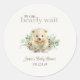 Sticker Baby shower d'hiver Cute Bear Cub Polar. Ce bébé ours polaire Cub se repose sur un lit d'eucalyptus et de verdure de pin avec une douce lueur de lumières d'arrosage. Coordination de la décoration de la fête baby shower et de la papeterie dans la collection de Baby showers Boho We Can Bearly Wait Winter.