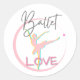 Spécialement pour les amateurs de danse, un design avec un texte, "Ballet Love", avec une ballerine rose dans une pose arabesque dans un cercle rose abstrait. Conception géniale pour autocollants et étiquettes..