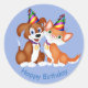 Autocollant d'anniversaire montré avec un joli chat jouant et imprimé chien. Customisez cet objet et ajoutez un nom ou achetez tel quel.