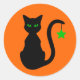 Caricature en silhouette d'un chat noir aux yeux verts contre un arrière - plan orange. Une étoile verte est suspendue à la queue du chat.