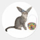 Le chaton aux oreilles de lapin est assis par un panier d'oeufs colorés de Pâques. Utilisez ces bâtons sur vos cartes de Pâques.
