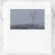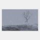 Paysage 3D froid et venteux en hiver, créé en Vue. Sur le sommet d'une colline blanche avec glace et neige, contre un ciel gris orageux avec pluie ou sommeil tombant régulièrement, un érablière nu et solitaire se dresse sous un banc en bois.