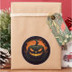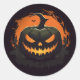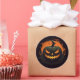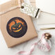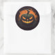 L'autocollant rond est affiché avec une impression citrouille effrayante Halloween. Customisez cet objet ou achetez tel quel.