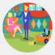 Ces Stickers Retro Martini Couple ressemblent à une scène d'une comédie romantique. Le cadre de ce style des années 60, design minimaliste, est une maison ou un appartement moderne élégamment décoré du milieu du siècle. La troupe est un couple séduisant qui profite d'une soirée remplie de conversations étincelantes, de bonne musique et de boissons sans fond. La salle est dotée d'un sol vert et d'un aqua et d'un mur turquoise en briques. Se reposant confortablement dans un mod, chaise d'oeuf orange est une belle femme. Sa robe rose vif est juste assez courte pour montrer ses jeux de forme. Avec la vague d'une main, cette beauté blonde a l'attention immédiate de son admirateur masculin. Son compagnon aux cheveux clairs porte un costume bleu, une chemise blanche et une cravate à arc noir. Dans ses mains, il tient deux lunettes de martini cristallin aux olives flottantes. Ne vous inquiétez pas. Il en offre une à sa copine. La paire a un temps si délicieux que ni l'un ni l'autre ne prend note de l'heure qui apparaît sur l'horloge kitschy, rouge, starburst sur le mur de brique derrière eux. Sur un mur rouge vif encastré, il y a trois Classic Movie Martini Stretched Canvas Prints, également disponible à la boutique Zazzle de StrangeLittleOnion (conseil, conseil!) Deux des tirages sont des arrière - plans turquoise et un est sur un arrière - plan noir dramatique. Un élégant bar humide est placé sous les empreintes. L'avant du bar turquoise présente trois diamants arlequins, dans les tons orange, turquoise et vert. On peut voir les silhouettes de lunettes à martini posées sur le comptoir. De l'autre côté de la pièce, un ottoman orange tient un lecteur de disques portable bleu et noir. Au sol, on voit les disques vinyles et une pochette d'album jaune vif. Ce duo séduisant est tellement délicieux que ni l'un ni l'autre ne prend note de l'heure qui apparaît sur l'horloge kitschy, rouge, starburst sur le mur de briques derrière eux.