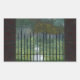 Un paysage en 3D au début de l'automne, représentant un sentier errant à travers l'herbe dans une forêt brumeuse d'arbres anciens et rongés. Mais le chemin surpeuplé est barré par un portail de pointes de fer noir entre des murs de briques foncées. Créé en Vue.