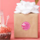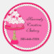 Joli autocollants ronds faits dans un arrière - plan rose deux tons, avec un cadre décoratif blanc à coquilles Saint-Jacques. Des graphismes colorés d'un stand de gâteaux remplis de cupcakes, décorent cet autocollant de boulangerie trop sucré. Le texte en noir est prêt à customiser pour votre entreprise. Idéal pour les boulangeries, les boulangeries et les décorateurs de gâteaux, à utiliser comme joints pour les boîtes à gâteaux et autres emballages. Personnalisez votre entreprise.