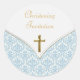 Élégant stickers de baptême bleu damassé. Ce magnifique autocollant bleu damask et or cross christening est facilement customisé pour votre événement en ajoutant les détails de votre événement, le style de police, la taille et la couleur de police et le libellé. Veuillez noter que tous les autocollants, cartes et modèles d'invitation que vous trouverez sur Zazzle sont des graphiques imprimés sans bijoux, arcs, surélevés, gaufrés, ni pièces ou pièces ajoutées.