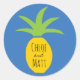 Coloré et décontracté parfait pour un été, plage mariage tropicale. Un ananas jaune avec des feuilles verts est assis sur un arrière - plan bleu océan. La police du nom du couple est hip et cool. Je pense que le chic boho va à la plage.