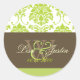 stickers de mariage Damask Monogramme vert (scellants d'enveloppe), teintes d'accent chocolat. Idéal pour un usage quotidien. Entièrement personnalisable. Les polices et les couleurs arrière-plan peuvent être facilement changées. Copyright © 2009 PixDezines.com et PixDezines sur zazzle.com