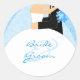 Autocollants de mariage personnalisés avec un design marié et marié tendance sur un arrière - plan tourbillon turquoise. Parfait pour les faveurs de mariage, les cadeaux de remerciement mariages, ou les faveurs de douche nuptiale. Obtenez les invitations et l'affranchissement correspondants pour compléter le look. Image © JD Digi Designs
