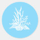 Joli stickers d'enveloppe mariage, avec des graphiques de coquillages et de corail blancs, sur un arrière - plan bleu clair. Belle façon de finir vos enveloppes de faire-part de mariage pour votre mariage à la plage.
