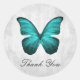Élégant et simple Mariage merci autocollant avec un papillon turquoise contre un arrière - plan gris grunge. Ce design est un choix unique pour un mariage moderne. Facile à customiser avec vos détails mariages. Cliquez sur "Customiser" pour trouver d'autres options de personnalisation.