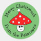 Un champignon de dessin animé avec un casquette rouge comme un chapeau de Père Noël souhaite un "Joyeux Noël" à la famille.