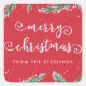 Stickers "Joyeux Noël" personnalisés avec de la neige glacée sur des branches de pin et un arrière - plan rouge festif. Customisez avec votre propre nom de famille. Parfait pour la décoration d'emballage cadeau, les enveloppes pour les cartes de Noël, ou préférez les décorations à une fête de Noël. [Note - les éléments de cette conception seront imprimés pour ressembler à une parties scintillant, mais il n'y a pas de parties scintillant réelle sur la carte.]