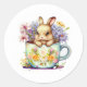Cet autocollant rond est montré en blanc avec un mignon lapin de Pâques dans un imprimé aquarelle tasse de thé. Customisez cet objet ou achetez tel quel. Image stock