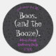 La décoration parfaite de la fête d'Halloween - vous pouvez mettre ces autocollants sur n'importe quoi! Boos and Booze Adult Halloween Cocktail Party Suite. Cet autocollant personnalisé personnalisé a un message personnalisé sur un arrière - plan noir moucheté. Une typographie éffrayante et un thème noir, vert et violet donnent à vos invités une décoration amusante dans ce qui sera sûrement une fête spottaculaire! Tout le texte est modifiable - il suffit de cliquer sur le bouton de personnalisation à droite. Découvrez les objets de décoration assortis de la collection !
