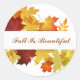 Autocollant rond illustré avec une jolie impression de feuilles d'automne. Customisez cet objet ou achetez tel quel. com.