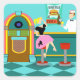 Servez quelque chose de spécial avec ces Stickers Fontaine Retro Soda. L'art minimaliste, dessin animé, présente l'intérieur du lieu le plus frais de la ville. C'est une fontaine de soda des années 50, dans toute sa gloire kitsch ! Sur fond de mur d'aqua, on peut voir une affiche qui annonce la spécialité de la maison. L'affiche montre un hamburger et une bouteille de pop pour le prix d'affaire de 15 cents. Avec des prix comme ceux-ci, difficile de regarder sa taille ! Un réducteur de soda très compétent est d'habiller le comptoir turquoise avec des accents jaunes. Le jeune homme qui a une forte éthique du travail tient un cône de crème glacée avec une seule boule de crème glacée jaune citron—bien que, pour être honnête, il pourrait être de l'ananas ! L'homme nettoyé porte une chemise blanche immaculée avec une cravate noire et arc et un casquette blanc aux accents rouges. De l'autre côté du comptoir, on aperçoit trois tabourets de bar rouge et chrome. Perché sur l'un des tabourets est une adolescente blonde dont la bouche arrose sûrement. On ne sait pas si sa bouche arrose le cône glacé qui se dirige vers elle ou le jeune homme industrieux qui le sert. Elle porte une jupe de caniche rose et un toit noir ajusté à la forme. Ses serrures jaunes sont retirées dans une queue de cheval classique. A côté de cette jolie clientèle se trouve un juke-box coloré et classique, qui est composé de brun, de grains de bois, de boiseries et de néons colorés. Mieux encore, il est sûr de présenter tous les plus grands succès rock et roll de l'époque ! Le sol de ce glacier moderne du milieu du siècle est un aqua et turquoise motif en damier qui crie juste pour que quelqu'un puisse essayer toutes les dernières danses.