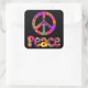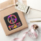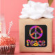 Un signe de paix fait avec ma fractale "Color Me Bright" et le mot "Peace" ci-dessous. Les couleurs comprennent le vert citron, le jaune, l'orange, le rose, le violet, le rouge et le bleu aqua. Le signe de paix et les lettres ont un contour rose. La couleur Arrière - plan peut être customisée.