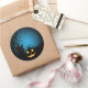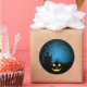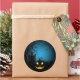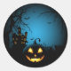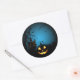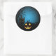 Autocollant de forme ronde affiché dans une impression hantante de scène citrouille Halloween. Customiser cet objet ou acheter tel quel. Image du stock freepik.com