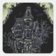 Petit autocollant carré montré dans un imprimé de maison hantée d'Halloween effrayant. Customiser cet objet ou acheter tel quel. Image du stock freepik.com
