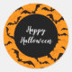 Un petit autocollant rond est affiché dans une impression de chauves-souris éffrayantes Halloween. Customisez cet objet ou achetez tel quel.