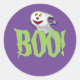 Un autocollant rond est affiché avec une empreinte de boo fantôme d'Halloween. Customisez cet objet ou achetez tel quel. com.
