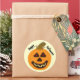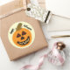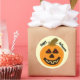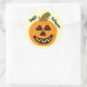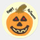 Un citrouille orange Jack-o-Lantern souriant avec les yeux rouges et la tige contre l'arrière - plan jaune pastel. Joyeuse typographie cool d'Halloween en noir. Oeuvre originale de TamiraZDesigns>