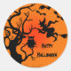 Stickers Halloween Witch Et Owl Halloween. Une sorcière sur un balai, une chouette sur un arbre éffrayant et des chauves-souris sur un arrière - plan orange.