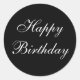 Autocollant rond en noir/blanc avec un voeu d'anniversaire heureux. Customisez cet objet ou achetez tel quel.