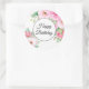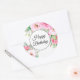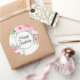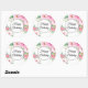 Un grand autocollant rond heureux d'anniversaire est montré avec une jolie impression florale rose. Customiser ou acheter tel quel.