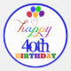 Stickers Joyeux Anniversaire Ballons de fête colorés avec différentes lettres de couleur pour le mot "Joyeux Anniversaire" dans les couleurs primaires et un bord bleu royal autour du cercle. Ajoutez l'âge de la fête que vous célébrez en remplaçant l'exemple de texte de "40ème" par le vôtre. Le mot "happy" est dans une police d'écriture manuscrite amusante et le mot "anniversaire" est en caractères gras. stickers de 40e anniversaire, 50e anniversaire, autocollants de 60e anniversaire, autocollants de 70e anniversaire, autocollants de 80e anniversaire