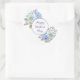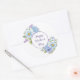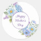 Le grand autocollant rond heureux de la Fête des Mères est montré avec un joli imprimé floral bleu et violet. Customiser ou acheter tel quel. Stock Imprimer freepik.com