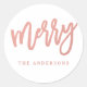 Design autocollant moderne populaire de vacances par Elke Clarke © avec une police de script magnifique avec le mot "joyeuse" dans un effet de feuille d'or faux rose.
