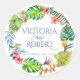 Aménagement floral aquarelle de feuilles tropicaux et de fleurs dans un cadre rond. Complique le faire-part mariage, enregistrer la date, les invitations, enveloppes, etc. avec le même design. Vous pouvez changer la couleur arrière - plan du blanc à n'importe quelle couleur que vous désirez (bien que le blanc semble le mieux). Tout type est personnalisable.