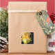 Des autocollants carrés modernes et arrondis avec la photo d'un iris barbu jaune doré frileux contre un champ noir d'arrière - plan et de modèle pour les noms des mariés et des mariés et la date du mariage. Tout le texte est personnalisable. © Little Wing Photographie et design
