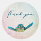 Des autocollants mariages "merci" à thème océanique. Une petite tortue de mer nage directement sur des autocollants à utiliser sur des faveurs, des cadeaux ou des enveloppes selon les besoins pour montrer l'appréciation des invités. L'arrière - plan est en dégradé bleu et rose. Le texte est écrit à la main en bleu foncé. Montré sur le petit autocollant rond, mais cette conception transfère également à l'autocollant carré.