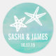 Le design présente deux étoiles de mer blanches sur fond aéré de traits d'aquarelle turquoise. Parfait pour les mariages plage ou de destination ! Coordonner les accessoires disponibles dans notre boutique.