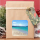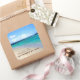 stickers de mariage avec un thème de plage ... bleu vert océan dans l'arrière - plan avec plage de sable et bleu clair ciel avec des nuages blancs bouffants. Conception amusante pour les soirées à thème plage, réceptions, douches nuptiales, sacs et plus encore.