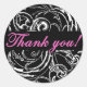 Faites de vos cartes de remerciements des cartes spéciales ! Que vous envoyiez des notes de remerciement pour des cadeaux de mariage, des cadeaux de douche, des cadeaux d'anniversaire ou toute autre raison, ajouter un bel autocollant à votre enveloppe le rendra beaucoup plus spécial. Celle-ci est élégante en tourbillons noirs et blancs avec un Merci fuschia au centre. Disponible en deux tailles.