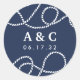 Des autocollants chic côtiers pour vos invitations de mariage ou vos faveurs présentent vos initiales et votre date de mariage en lettres blanches sur un arrière - plan bleu marine classique, flanqué d'illustrations de cordages nautiques en boucle.