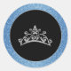 Autocollant rond montré avec arrière - plan noir avec une image de cime argentée gris. A un éclat de couleur et d'éclat avec une bordure en faux bleu parties scintillant-look. L'option Filtre offre des choix de couleurs limités, ou téléchargez vos propres images. Customiser ou acheter tel quel.