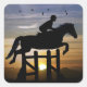 Un saut parfait, un cheval et un cavalier à un événement de cavalier de chasseur, en silhouette par un beau lever de soleil. Cet autocollant cheval et cavalier les montre parfaitement synchronisés. Un autocollant amusant pour l'amoureux du cheval.