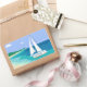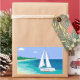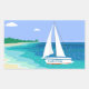 Stickers Plage Tropicale Côtière Monogram Sailboat. Un voilier avec votre nom sur elle s'approche d'une plage. Vue sur la mer tropicale. Bleu, turquoise, mousse de mer, turquoise, vert, blanc.