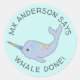 Un joli narval arc-en-ciel sur un arrière - plan bleu marine clair. Le texte dit "Mx Anderson dit Whale Done !" et peut être modifié pour un nom/message personnalisé. Idéal pour les enseignants comme récompenses pour les étudiants.