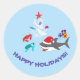 Stickers avec design de Noël océanique mignon. Le design se compose d'un mignon requin portant un chapeau de Père Noël et portant des cadeaux de Noël, une mignonne tortue verte et un mignon crabe rouge. Le design est complété par un petit corail blanc aménagé comme un sapin de Noël et décoré de coquillages bleus, roses et violets et d'une étoile de mer rouge. Le texte dit "Joyeuses fêtes !". La conception est personnalisable et vous pouvez personnaliser le texte.
