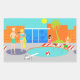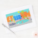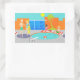 Entrez ! L'eau est correcte ! Ces Stickers Retro Pool Party comprennent un dessin animé animé animé animé d'une soirée de billard amusante et sophistiquée. Le design moderne du milieu du siècle s'articule autour d'une piscine ronde sur un grand patio gris en béton. La piscine est remplie d'eau turquoise. Des briques orange entourent la piscine et il y a un plongeoir blanc à planches prêt pour une âme aventureuse. Une balle de plage rouge et blanche flotte dans l'eau. De l'autre côté de la piscine, deux fêtards se baladent les pieds dans l'eau, allongés sur des serviettes de plage rayées rouges et blanches. La femme aux cheveux noirs porte un maillot de bain rose et une pièce. A côté d'elle, une boisson tropicale dans une noix de coco avec un petit parapluie et une paille verte. L'homme blond porte des troncs verts et lumineux. On lui donne un coup de pied avec les mains derrière la tête. À gauche de la piscine, se trouve un homme distingué aux cheveux blancs et aux maillots de bain en jade qui tient un verre en coquille de coco. Nous savons qu'il est distingué parce qu'il est un homme aux cheveux blancs ! Il s'adresse à une femme aux cheveux blonds et à une figure en sablier en maillot de bain turquoise. Le poumon sur son bras est une serviette de plage jaune> Derrière cette scène se trouve la silhouette verte d'un palmier et d'une maison futuriste en brique orange. Par les grandes baies vitrées bleues, on aperçoit la silhouette d'une télévision, d'une chaise, d'un ottoman et d'une starburst clock. Le ciel derrière la maison est un turquoise sans nuages avec un soleil rond et jaune.