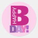 Un ensemble d'autocollants ronds Joyeux Anniversaire, simples et amusants, avec les mots "Anniversaire heureux !" dans différentes nuances de rose et de violet. Les couleurs des lettres peuvent être modifiées — cliquez sur "Personnaliser".