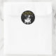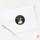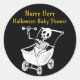 Autocollants de baby shower Halloween personnalisés qui offrent un design rond, noir arrière - plan et or lettrage sur le dessus des autocollants. Les autocollants de baby shower montrent un squelette de bébé assis dans un pram et jouant joyeusement avec un squelette en forme d'os. Tous les textes peuvent être personnalisés pour votre journée de baby shower à thème Halloween.