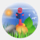 Bookworm © Sunny Mars Designs. Des autocollants ronds adorables avec l'illustration d'un ver rose mignon lisant un livre assis sur un abricot avec des galets feuille et de l'herbe autour de lui.